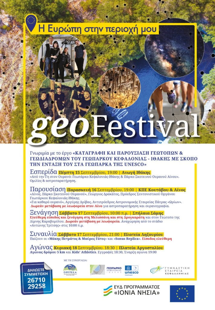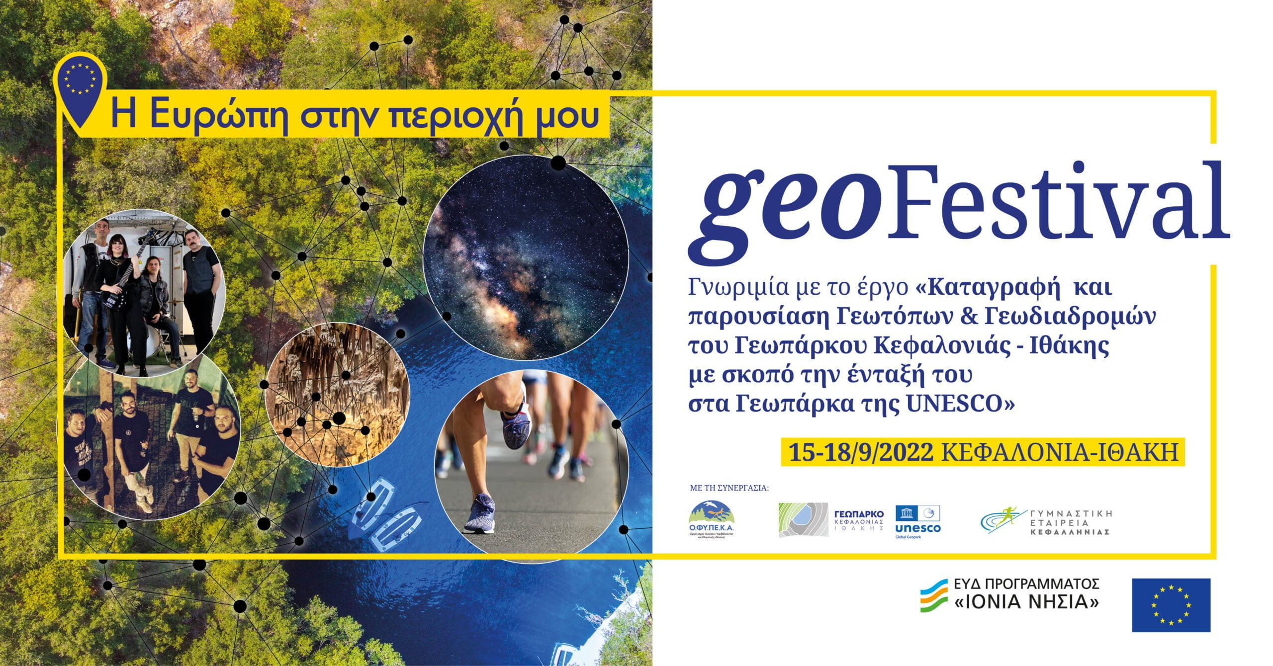 Η Περιφέρεια Ιονίων Νήσων και η Ειδική Υπηρεσία Διαχείρισης Ε.Π. «Ιόνια Νησιά» διοργανώνουν μια σειρά εκδηλώσεων γνωριμίας με το έργο και το Γεωπάρκο από 15-18 Σεπτεμβρίου 2022 με τον γενικό τίτλο GEO–FESTIVAL.