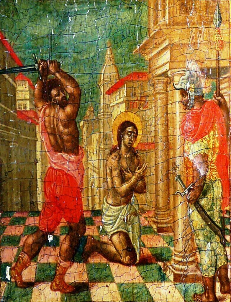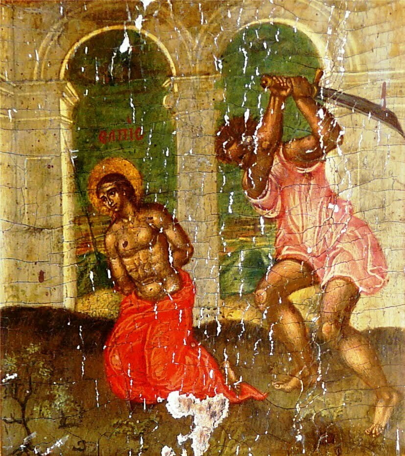 Σχολιάζοντας αναλυτικά την κάθε μικρογραφία από αριστερά της μορφής της Αγίας Σοφίας, εικονίζεται στο πάνω μέρος: «Η απότμησις της κεφαλής της Αγίας Ελπίδος». Από κάτω ακριβώς, σε κάθετη στοίχιση είναι η μικρογραφία που εικονίζει το θέμα: «Η απότμησις της κεφαλής της Αγίας Πίστεως» και η επόμενη από κάτω είναι η μικρογραφία που εικονίζει το θέμα: «Η απότμησις της κεφαλής της Αγίας Αγάπης».