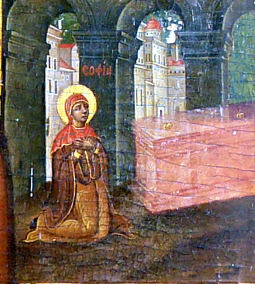 Δεξιά από τη μορφή της Αγίας Σοφίας υπάρχουν σε κάθετη στοίχιση άλλες τρεις μικρογραφίες στις ίδιες διαστάσεις με αυτές που βρίσκονται αριστερά της και εικονίζουν σκηνές μαρτυρίου. Συγκεκριμένα : Στην πρώτη πάνω δεξιά από το σώμα της Αγίας εικονίζεται : «Η μαστίγωση της Αγίας Ελπίδος με βούνευρα», ακολουθεί στην κάθετη στοίχιση η εικονογραφία με θέμα, «Η απότμησις των μαστών της Αγίας Πίστεως» και η τρίτη μικρογραφία εικονίζει το θέμα, «Η κοίμηση της Αγίας Σοφίας, ενώ προσεύχεται έμπροσθεν του κιβωρίου που περιέχει τα ιερά λείψανα των θυγατέρων της». Σύμφωνα με το συναξάρι της Αγίας, αφού τελείωσε το μαρτύριο των τριών θυγατέρων της, τις ενταφίασε και τρεις μέρες αργότερα η μητέρα τους Σοφία, ήρθε στο μνήμα τους. Έκλεισε τα μάτια της και παρέδωσε την ψυχή της στα χέρια του Θεού με τα παρακάτω λόγια. «Αγαπημένα μου παιδιά, δεχτείτε τη μητέρα σας εκεί , όπου σείς αναπαύεστε»