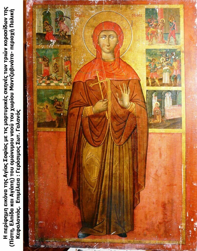 Πρόκειται για μια θαυμάσια και μοναδική εικόνα, μεγάλων διαστάσεων, ανυπόγραφη, η οποία εικονίζει την Αγία Σοφία, σε ολόσωμη ορθή στάση με το σταυρό στο αριστερό χέρι και δεξιά και αριστερά της υπάρχουν από τρεις μικρογραφίες με το μαρτύριο των τριών θυγατέρων της και το δικό της. Μαρτύρησαν επί Ανδριανού (117-138). Αυτή η διαφορετική εικονογραφία της Αγίας Σοφίας και των τριών θυγατέρων της από τη συνηθισμένη, που κυριαρχεί σχεδόν πανελληνίως, αλλά διαφορετική ακόμη και από τη δυτική καθολική αγιογραφική τεχνοτροπία, είναι ο λόγος, που καθιστά τη συγκεκριμένη εικόνα μοναδική και αξιόλογη.