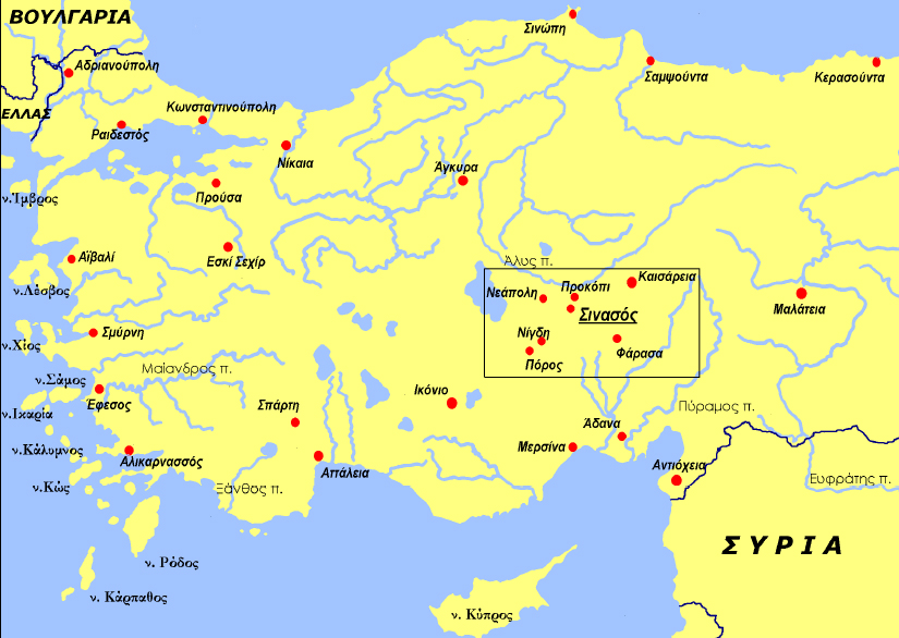 Η Σινασός βρίσκεται στην “καρδιά” της Καππαδοκίας στην κεντρική Μικρά Ασία της σημερινής Τουρκίας.