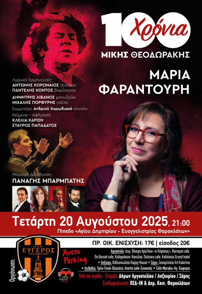 Η Μαρία Φαραντούρη, η ιέρεια του Μίκη Θεοδωράκη,έρχεται στην Κεφαλονιά στις 20 Αυγούστου στο Δημοτικό Στάδιο Φαρακλάτων.Πρόκειται για μια ιστορική ,κορυφαία συναυλία για τον πολιτισμό του νησιού μας ,φέτος που συμπληρώνονται τα 100 χρόνια από την γέννηση του Μίκη Θεοδωράκη.Η Μαρία Φαραντούρη κατάγεται από την Κεφαλονιά , ο πατέρας της ονομαζόταν Στεφανογεράσιμος Φαραντούρης από την περιοχή της Σάμης.