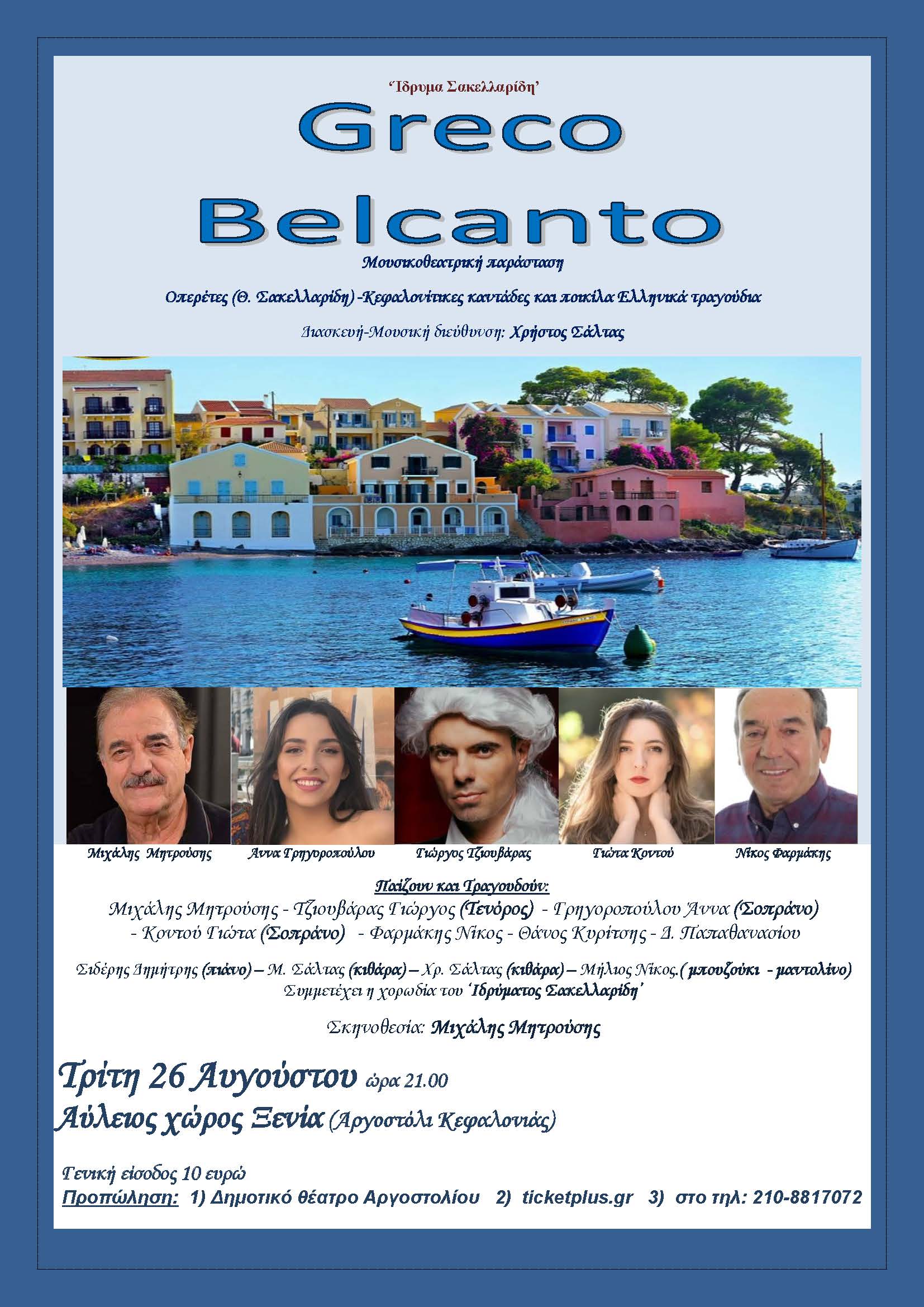 Στον Αύλειο χώρο ΞΕΝΙΑ στις 9 μμ, το Ίδρυμα Σακελλαρίδη θα παρουσιάσει τη χαρούμενη και δροσερή Μουσικοθεατρική παράσταση GREKO BELCANTO, με αποσπάσματα από οπερέτες του Θ. Σακελλαρίδη (πρώτο μέρος), πάνω σε διασκευή κειμένων Χρήστου Σάλτα και σκηνοθεσία Μιχάλη Μητρούση, με εκπλήξεις και απρόοπτα (όπως συνηθίζεται άλλωστε στις οπερέτες), ακολουθούμενες στο δεύτερο μέρος από γνωστές Κεφαλλονίτικες καντάδες από τη Χορωδία του Ιδρύματος Σακελλαρίδη και στο τρίτο και τελευταίο μέρος με όμορφα Ελληνικά τραγούδια!