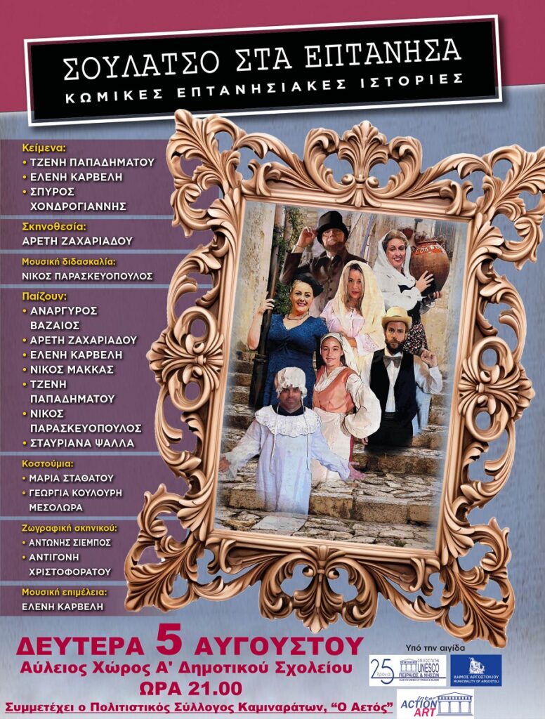 Με στόχο την ανάδειξη και προώθηση της Επτανησιακής παράδοσης, ο Δήμος Ληξουρίου φέρνει στον Αύλειο χώρο του Ά Δημοτικού Σχολείου την παράσταση «ΣΟΥΛΑΤΣΟ ΣΤΑ ΕΠΤΑΝΗΣΑ». Η παράσταση αποτελείται από μονόπρακτες κωμικές ηθογραφίες, με ζωντανή μουσική (κιθάρα, μαντολίνο, τραγούδι), και επτανησιακές Καντάδες πάνω σε παραδοσιακές ιστορίες των Επτανήσων που έχουν περάσει προφορικά από γενιά σε γενιά, καθώς και καταγεγραμμένες ιστορίες από επτανήσιους συγγραφείς, που έχουν προσαρμόσει σε θεατρική μορφή, η Τζένη Παπαδημάτου και η Ελένη Καρβέλη. Όλοι οι ήρωες, άλλοτε λαϊκοί, άλλοτε αριστοκράτες, με τη χαρακτηριστική επτανησιακή τους διάλεκτο και την ιδιόμορφη συμπεριφορά τους, φωτογραφίζουν την εικόνα μιας συγκεκριμένης εποχής (αρχές