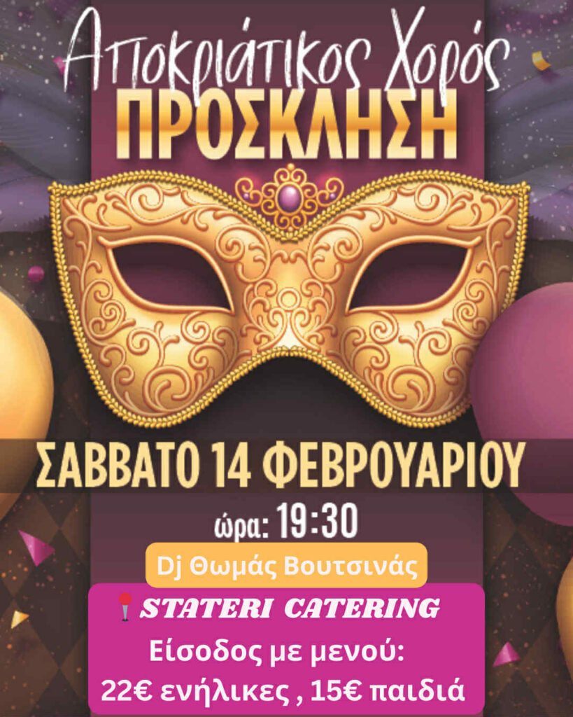 Μικροί και Μεγάλοι φορέστε τις αποκριάτικες στολές σας και ελάτε να χορέψουμε και να διασκεδάσουμε με ελληνικούς, παραδοσιακούς, ρεμπέτικους, μοντέρνους, disco, Latin καρναβαλικούς  και άλλους ρυθμούς, μέσα από την υπέροχη μουσική του μοναδικού DJ Thomas-Θωμά Βουτσινά.