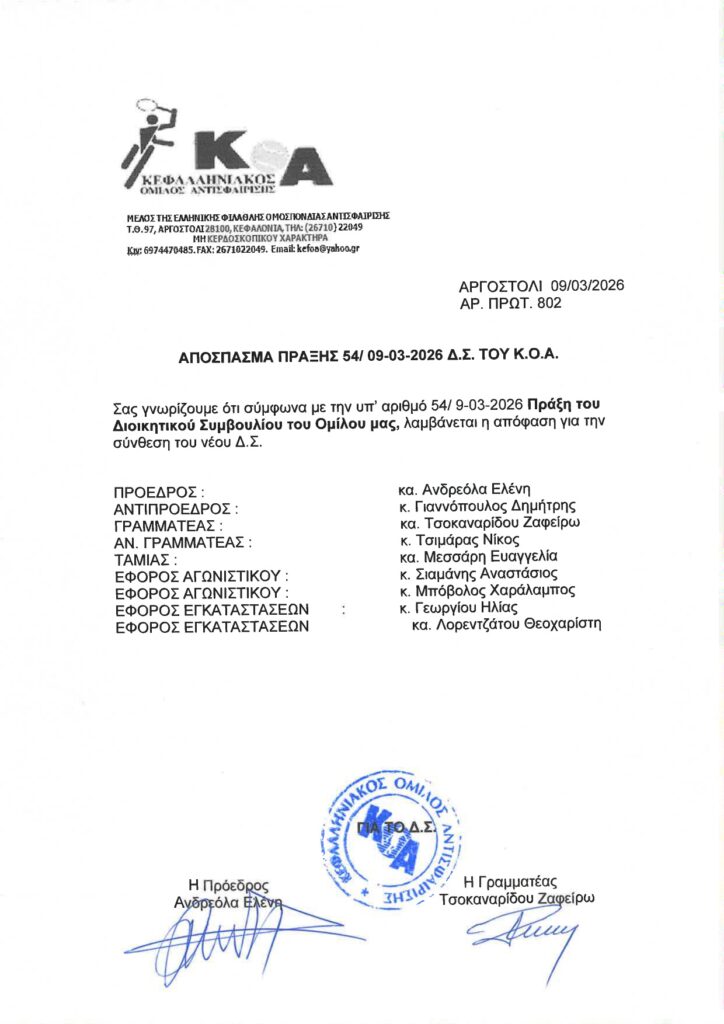 Η σύνθεση του νέου ΔΣ του Κεφαλληνιακού Ομίλου Αντισφαίρισης
