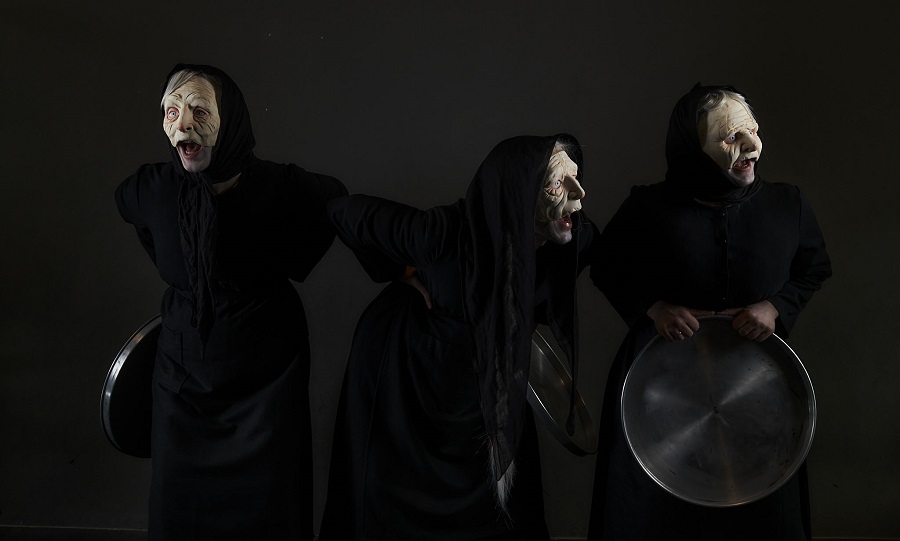 Αυτές οι «Γυναίκες της Γης» που έμεναν αόρατες χρόνια ακόμα και για τους ερευνητές – αφού δεν θεωρούσαν άξιο καταγραφής τον λόγο μιας γυναίκας για την ιστορία ενός τόπου- προσεγγίζονται σκηνικά από τρία αρσενικά νεαρά σώματα, επιχειρώντας να φέρουν στη σκηνή το προσωπικό και συλλογικό αφήγημα του οικείου γηρασμένου θηλυκού σώματος. Με εκφραστικά εργαλεία τις πρώτες ύλες της τελετουργικής διαδικασίας, τη μεταμφίεση, τη μάσκα και τον συντονισμό του λόγου και του σώματος, οι τρεις ηθοποιοί επιδίδονται σε ένα καταιγιστικό storytelling που ταξιδεύει από τις Μεταμορφώσεις του Οβίδιου και τα