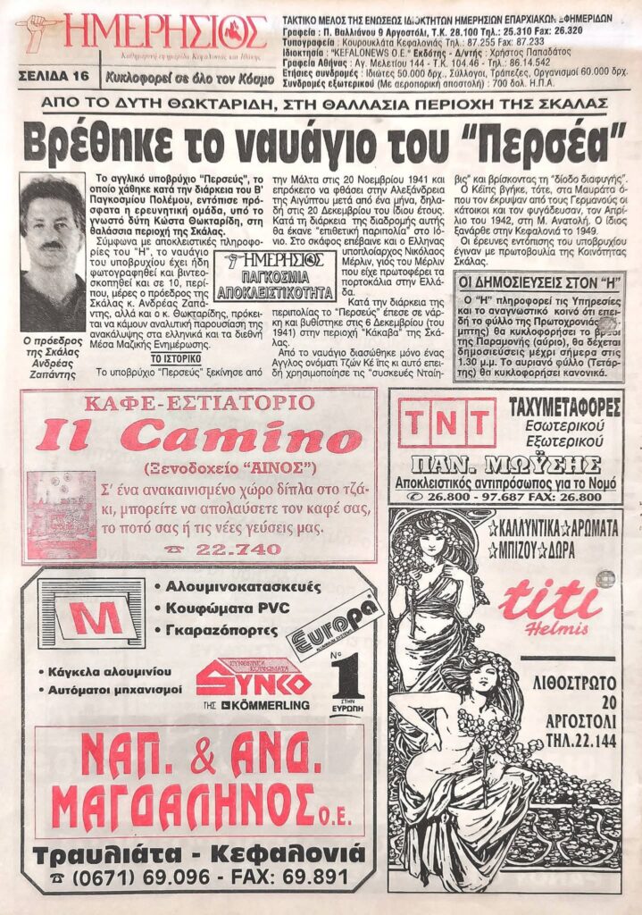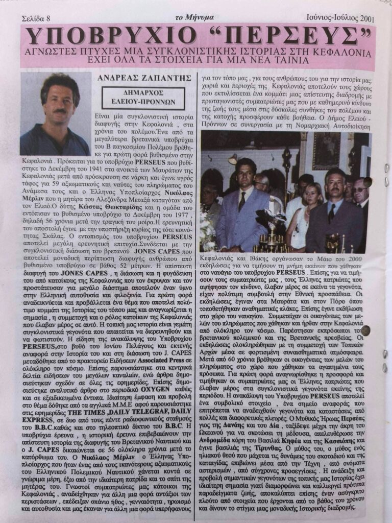 Το μεσημέρι του Σαββάτου 18 Απριλίου 2026, ο πρώην Δήμαρχος Ελειού-Πρόννων Ανδρέας Ζαπάντης παρέσχε μια εξαιρετικά ενδιαφέρουσα και ιστορικά σημαντική ενημέρωση, στα αγγλικά, στους Βρετανούς και Έλληνες διοργανωτές της προγραμματισμένης εκδήλωσης μνήμης για το Βρετανικό Υποβρύχιο Περσέας, που θα πραγματοποιηθεί την Παρασκευή 19 Ιουνίου 2026 στον Πόρο Κεφαλονιάς.
