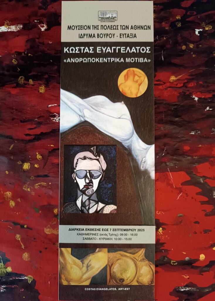 Στο εμβληματικό Αρχοντικό Δεκόζη Βούρου στο κέντρο της Αθήνας, με την ξεχωριστή ιστορικότητα και τον επιβλητικό διάκοσμο, όπου στεγάζεται το Μουσείο της Πόλεως των Αθηνών- Ίδρυμα Βούρου-Ευταξία, το ένζωο παρελθόν ανατρεπτικά, αιφνίδια και δυναμικά συναπαντάται με το τώρα, το τότε και το μετά, μέσα από τα φιλοξενούμενα έργα της αναδρομικής έκθεσης του Κώστα Ευαγγελάτου με θέμα «Ανθρωποκεντρικά Μοτίβα» . Καλλιτέχνης έμπειρος, ανήσυχος, τολμηρός, έχοντας πίσω του μια πολύχρονη παρακαταθήκη έργων με ποικιλόμορφο χαρακτήρα, που φέρουν την ιδιαίτερη προσωπική του σφραγίδα και τον καθιστούν ξεχωριστό και αναγνωρίσισμο, αυτή τη φορά εκπλήσσει με τη θεματολογία, τη μέθοδο και την ένταση των δημιουργιών του και αποκαλύπτει την ευτολμία και το χάρισμά του.