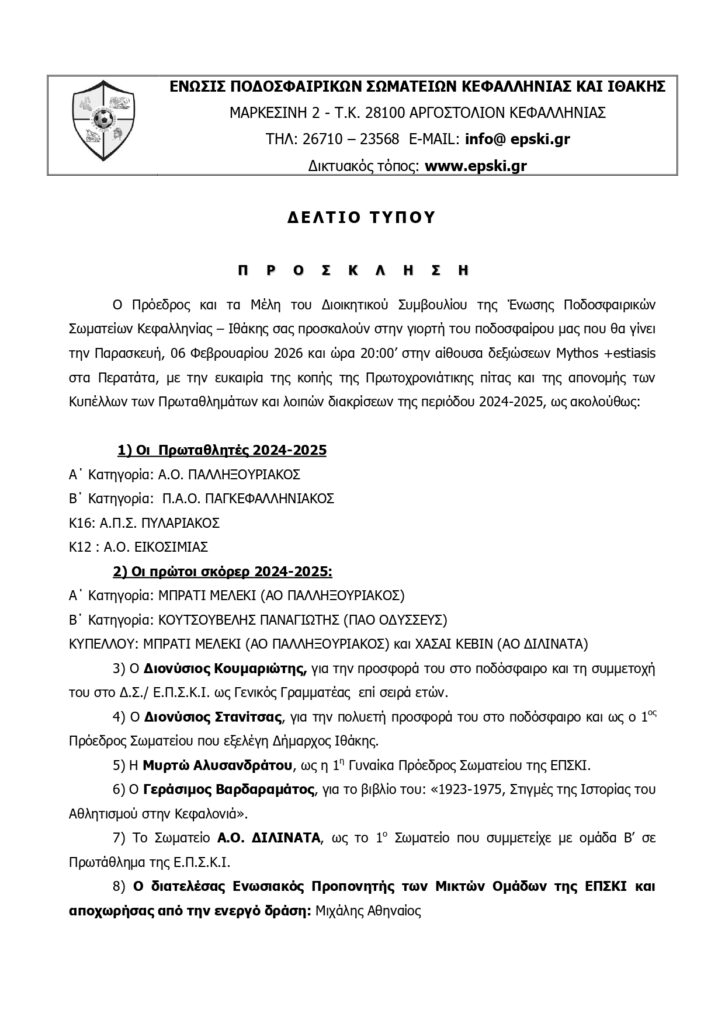 Κοπή Πρωτοχρονιάτικης πίτα και απονομή Κυπέλλων για την ΕΠΣΚΙ την Παρασκευή 6 Φεβρουαρίου
