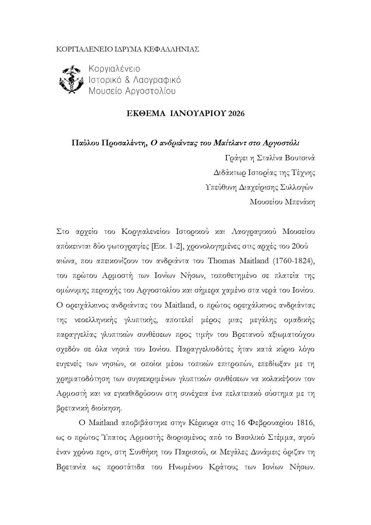 HomeΠολιτισμόςΚοργιαλένειο Μουσείο Έκθεμα Ιανουαρίου 2026-Παύλου Προσαλέντη, Ο ανδριάντας του Μαίτλαντ στο Αργοστόλι