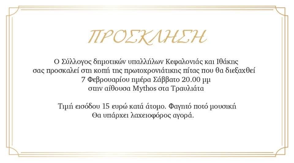 Κόπη πίτας για τον Σύλλογο Δημοτικών Υπαλλήλων το Σάββατο 7 Φεβρουαρίου στο “Mythos”