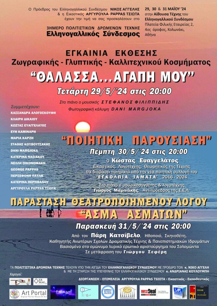 Στα πλαίσια του 3ήμερου Πολιτιστικών Δρώμενων Τέχνης που θα παραγματοποιηθεί στην Αίθουσα του Ελληνογαλικού Συνδέσμου, με την διοργάνωση – επιμέλεια της εικαστικού-εκπαιδευτικού Αργυρούλας Pappas- Τσιώτα, θα γίνει την Πέμπτη 30 Μαίου, ώρα 8 μ.μ. ποιητική παρουσίαση του εικαστικού, λογοτέχνη, θεωρητικού της τέχνης Κώστα Ευαγγελάτου.