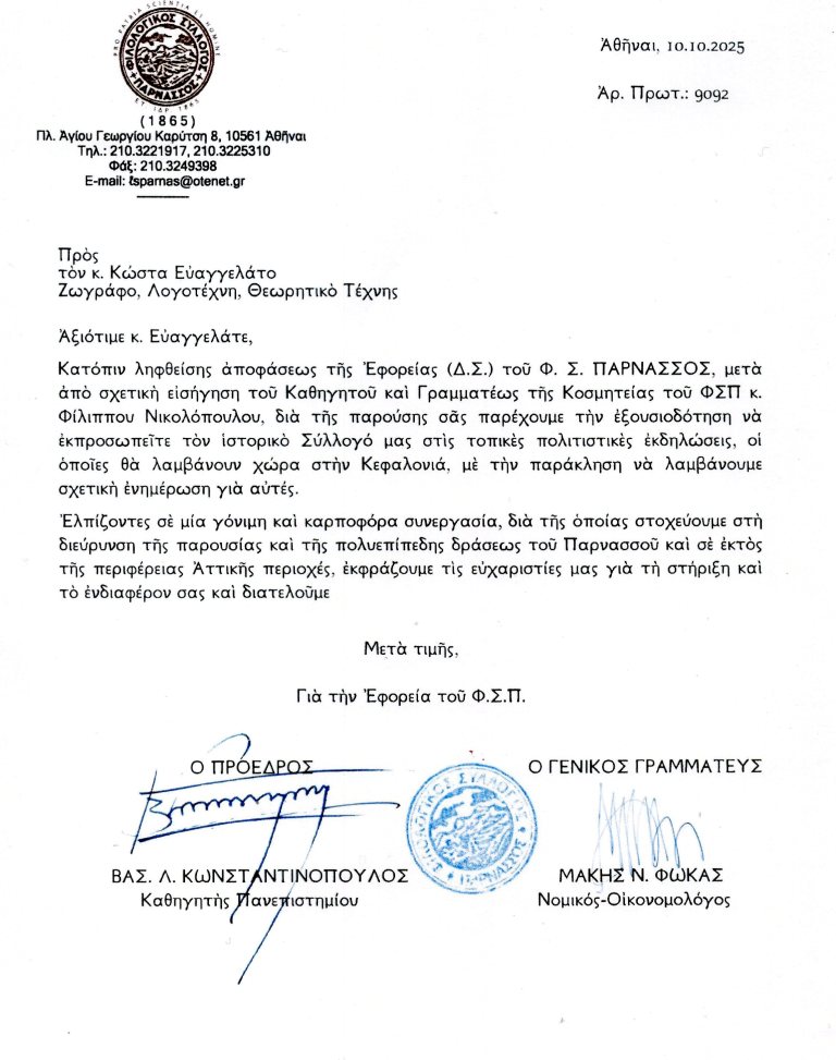 Τακτικό μέλος και επίσημος εκπρόσωπος του Φ.Σ. ΠΑΡΝΑΣΣΟΣ στην Κεφαλονιά.
