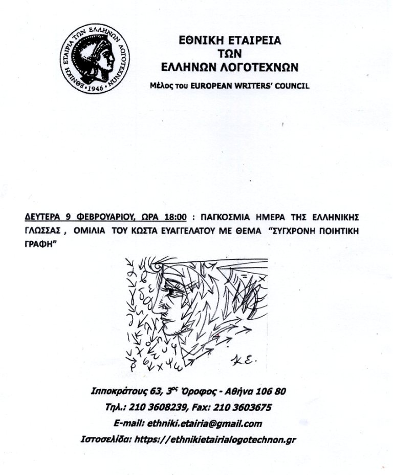 Στις 9 Φεβρουαρίου2026, ώρα 18:00 θα πραγματοποιηθεί ομιλία του Κώστα Ευαγγελάτου, μέλους του Διοικητικού Συμβουλίου της ΕΕΕΛ, Ιπποκράτους 63, Αθήνα, με θέμα: «Παγκόσμια Ημέρα της Ελληνικής Γλώσσας. Σύγχρονη ποιητική γραφή.»