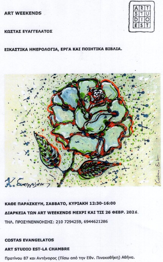 Τα ετήσια Art Weekends στο χώρο του ART STUDIO EST-LA CHAMBRE, Πρατίνου 87, Αθήνα, θα συνεχιστούν μέχρι τις 26 Φεβρουαρίου 2026. Εκτίθενται εικαστικά έργα μικρών διαστάσεων , επιζωγραφισμένα αντικείμενα και εκδόσεις τέχνης.