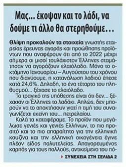 -Αύξηση της δαπάνης για ελαιόλαδο κατά 28% το 2023 έναντι του 2022 και κατά 7% σε σχέση με το 2009.