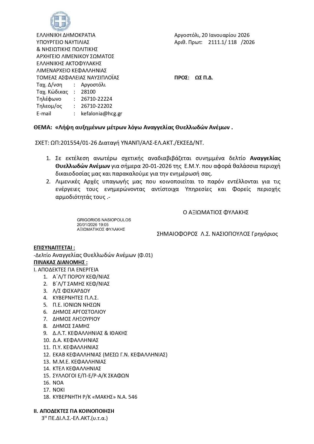 Λήψη αυξημένων μέτρων λόγω Αναγγελίας Θυελλωδών Ανέμων