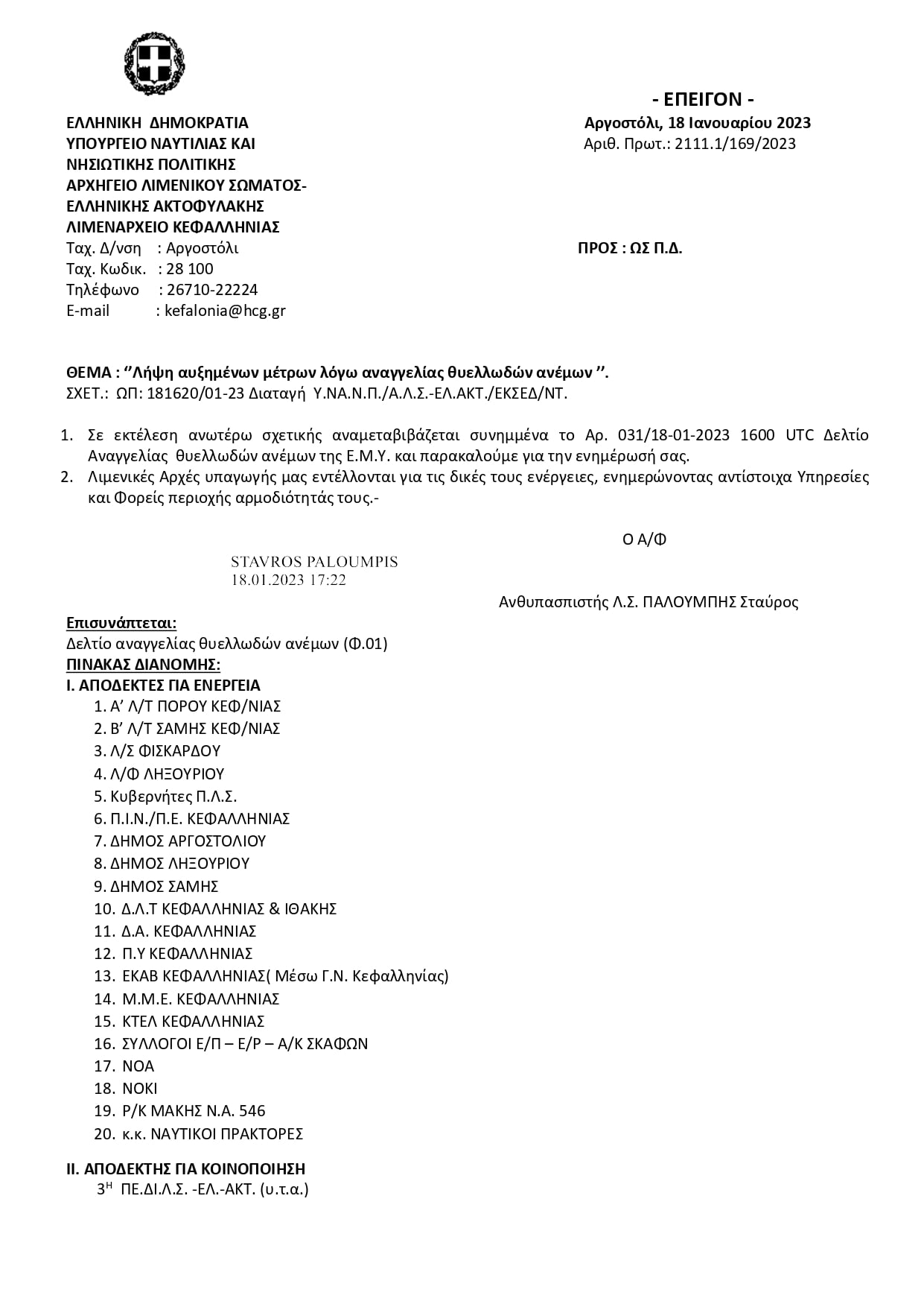 Λήψη αυξημένων μέτρων λόγω αναγγελίας θυελλωδών ανέμων