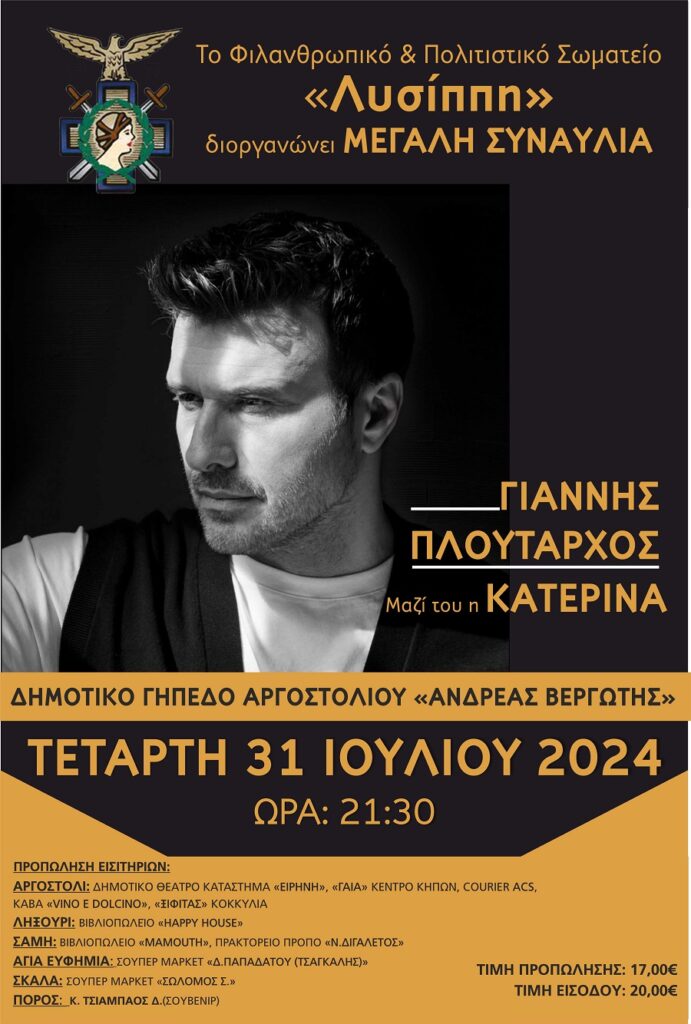 Το Φιλανθρωπικό και Πολιτιστικό Σωματείο “Λυσίππη” διοργανώνει μεγάλη συναυλία με τον Γιάννη Πλούταρχο την Τετάρτη 31 Ιουλίου στις 9.30 μ.μ. στο Δημοτικό Γήπεδο Αργοστολίου “Ανδρέας Βεργωτής”. Μαζί του η Κατερίνα. Τα έσοδα της συναυλίας θα διατεθούν για τις ανάγκες της Μονάδα Τεχνιτού Νεφρού του Γενικού Νοσοκομείου Κεφαλληνίας.