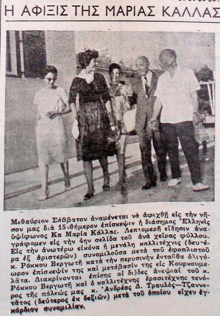 Η τοπική εφημερίδα «Τα Νέα» στις 2/8/1962, στη σελίδα 4, προαναγγέλλει ότι θα έρθει η διάσημος Ελληνίς υψίφωνος Μαρία Κάλλας και ότι θα παραμείνει για δεκαπέντε ημέρες. Η Κάλλας με τον Ωνάση θα έρθουν με τη θαλαμηγό « Χριστίνα» η οποία θα καταπλεύσει στο λιμάνι του Αργοστολιού. Στη «Χριστίνα» επέβαιναν και άλλες προσωπικότητες και ο συμπολίτης μας Παν. Βεργωτής. Το δημοσίευμα ενημέρωνε για τον παραθερισμό της στο νησί μας και για τη φιλοξενία του Ωνάση και της Κάλλας από την οικογένεια Βεργωτή.