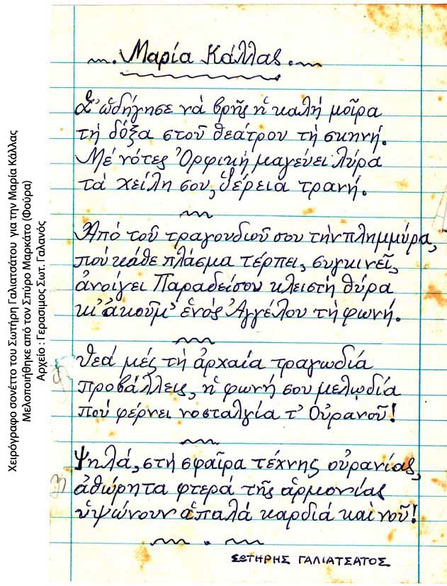 Πήρα να πω δυο λόγια για τη ζωή σου. Είναι αλήθεια πως εγκατέλειψες τη γυναίκα για χάρη της τέχνη σου. Έτσι, αγαπητή Κάλλας συμβαίνει ή το ορίζει η ειμαρμένη για αυτούς που τάσσονται μοναδικοί. Αργότερα σε παρέσυρε με το δίκιο του ο Έρωτας για να ζήσης τη γυναίκα Μαρία και την Κάλλας την παραμέρισες αναγκαστικά. Πέρασες από τη Μήδεια και τη Νόρμα, από την Άννα Μπολένα και τη ως Βιολέτα στο ρόλο της Μαρίας, το τραγικό μελόδραμα της ζωής σου.