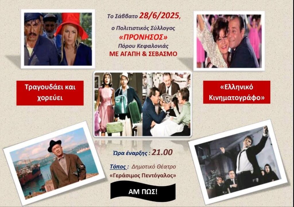 Με μεγάλη επιτυχία και πλήθος κόσμου, κάτω από τα αστέρια του καλοκαιρινού ουρανού, έγινε το βράδυ του Σαββάτου 28 Ιουνίου η χορευτική και θεατρική εκδήλωση του Πολιτιστικού Συλλόγου του Πόρου Κεφαλονιάς “Ο Πρόνησος” με θέμα τον Ελληνικό κινηματογράφο!