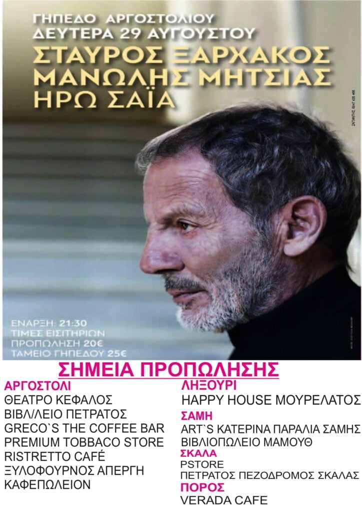 Την Δευτέρα 29-8-2022 και ώρα 21.30 θα πραγματοποιηθεί στο Δημοτικό Αθλητικό Κέντρο Αργοστολίου «Ανδρέας βεργωτή», η μεγάλη συναυλία του Σταύρου Ξαρχάκου, υπό την αιγίδα του Δήμου Αργοστολίου.