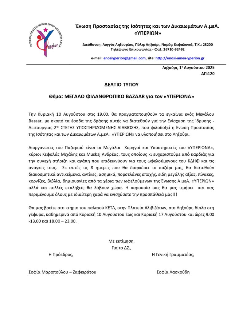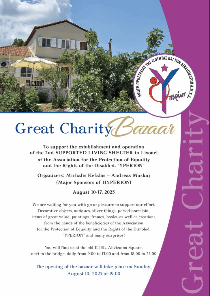 Μεγάλο φιλανθρωπικό bazaar για τον “Υπερίωνα” την Κυριακή 10 Αυγούστου