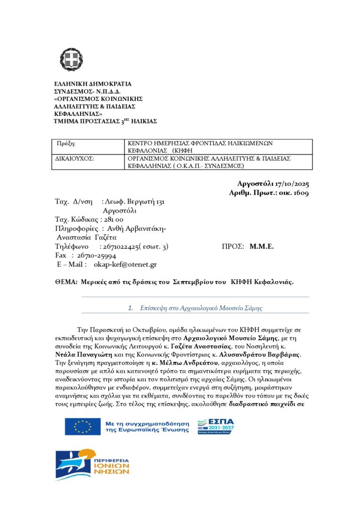 Μερικές από τις δράσεις του Σεπτεμβρίου του ΚΗΦΗ Κεφαλονιάς
