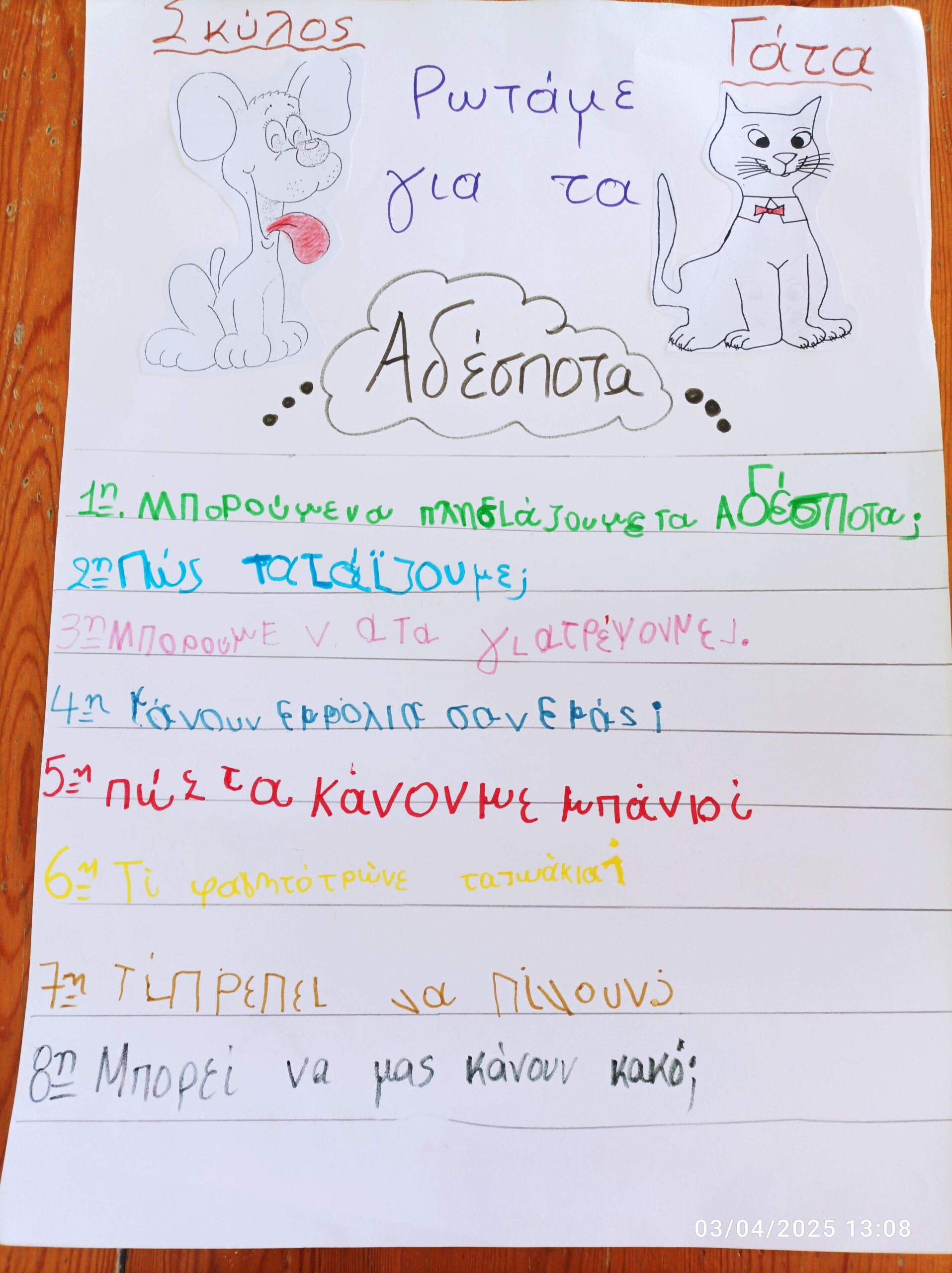 Αμέσως μετά το Πάσχα θα πραγματοποιηθεί μία ανοικτή συνάντηση διαλόγου σε κεντρικό σημείο της πόλης, όπου θα τελεσφορήσει μαθητικός διαγωνισμός έκθεσης και ζωγραφικής με θέμα τα αδέσποτα ζώα.