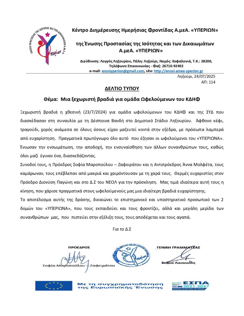 Μια ξεχωριςστή βραδιά για ομάδα Ωφελούμενων του ΚΔΗΦ στην συναυλία της Δέσποινας Βανδή