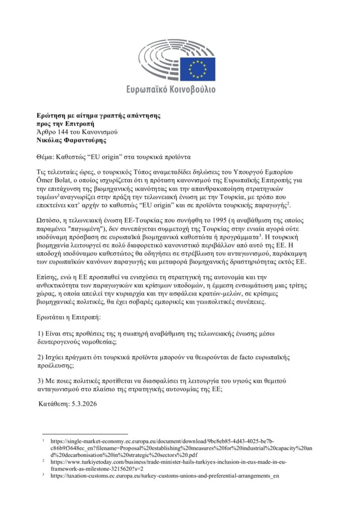 Στην ερώτησή του, ο Νικόλας Φαραντούρης επισημαίνει ότι η τελωνειακή ένωση μεταξύ της Ευρωπαϊκή Ένωση και της Τουρκίας, που θεσπίστηκε το 1995, δεν συνεπάγεται συμμετοχή της Τουρκίας στην ενιαία αγορά ούτε ισοδύναμη πρόσβαση στα ευρωπαϊκά βιομηχανικά καθεστώτα. Υπογραμμίζει επίσης ότι η τουρκική βιομηχανία λειτουργεί σε διαφορετικό κανονιστικό περιβάλλον από εκείνο της ΕΕ, γεγονός που θα μπορούσε να οδηγήσει σε στρέβλωση του ανταγωνισμού και παράκαμψη των ευρωπαϊκών κανόνων παραγωγής.