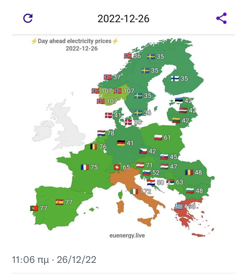 Ας μας εξηγήσει λοιπόν ο πρωθυπουργός πως γίνεται να έχουμε και πάλι για μια εβδομάδα σταθερά την ακριβότερη χονδρεμπορική τιμή ρεύματος, γεγονός που βιώνουμε όλο το 2022, ενώ για τις άλλες Ευρωπαϊκές χώρες δεν φαίνεται να υπάρχει πόλεμος στην Ουκρανία και περιορισμός ή αύξηση στις τιμές του φυσικού αερίου.