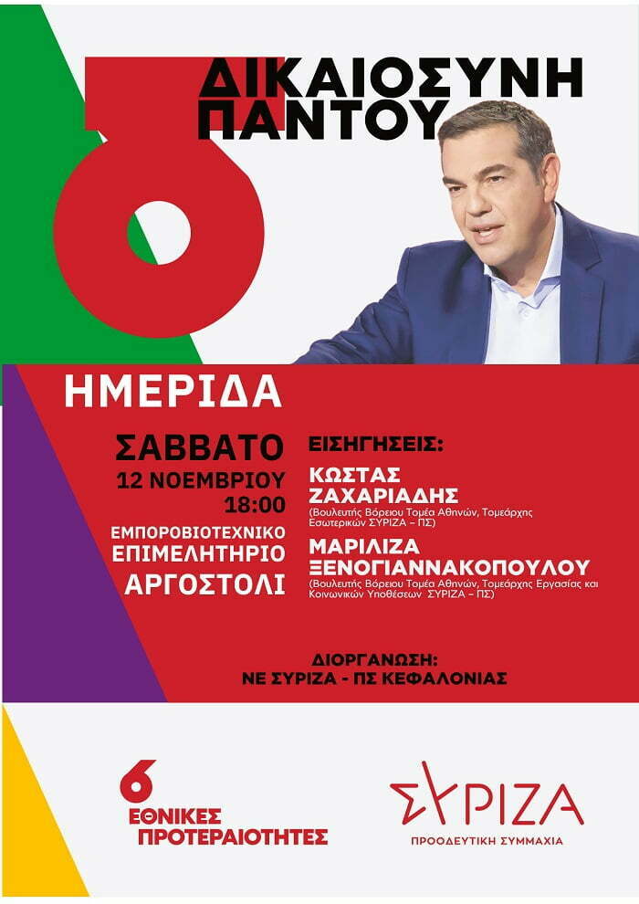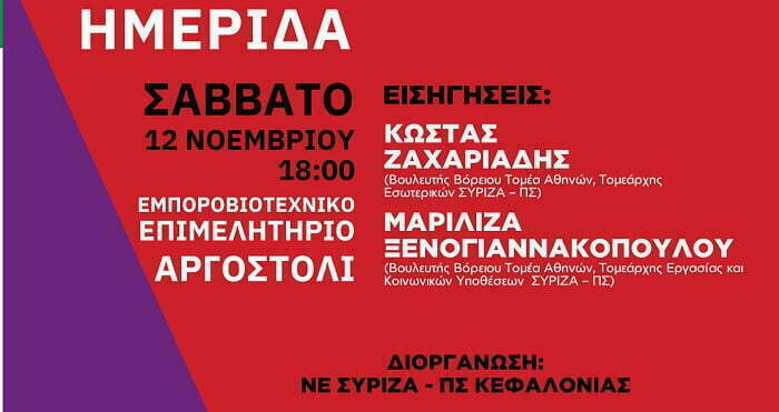 Θα αναλυθούν οι 6 εθνικές προτεραιότητες του ΣΥΡΙΖΑ-ΠΣ,  με ομιλητές τον Τομεάρχη Εσωτερικών Κώστα Ζαχαριάδη και την Τομεάρχη Εργασίας και Κοινωνικών Υποθέσεων Μαριλίζα Ξενογιαννακοπούλου, που συνοδεύονται από το μέλος της Οργανωτικής Γραμματείας της Κ.Ε, Αλέξη Χριστόπουλο, σήμερα Σάββατο 12 Νοεμβρίου 2022,  στο Εμπορικό Επιμελητήριο Κεφαλονιάς-Ιθάκης στις 6 το απόγευμα.
