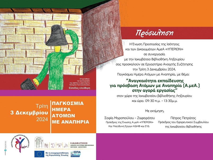 Υπενθυμίζουμε τη διοργάνωση Εργαστηρίου Ανοικτής Συζήτησης με θέμα «Αναγκαιότητα εκπαίδευσης για πρόσβαση ΑμεΑ στην αγορά εργασίας» από την Ένωση Προστασίας της Ισότητας και των Δικαιωμάτων ΑμεΑ «Υπερίων» σε συνεργασία με την Ιακωβάτειο Βιβλιοθήκη, την Τρίτη, 3 Δεκεμβρίου 2024, 9.30 π.μ. – 1.30 μ.μ., με την ευκαιρία της Παγκόσμιας Ημέρας Ατόμων με Αναπηρία, στο Μουσείο Ληξουρίου.
