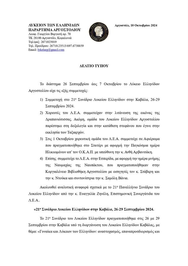 Οι δράσεις του Λυκείου Ελληνίδων παράρτημα Αργοστολίου