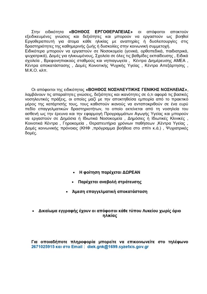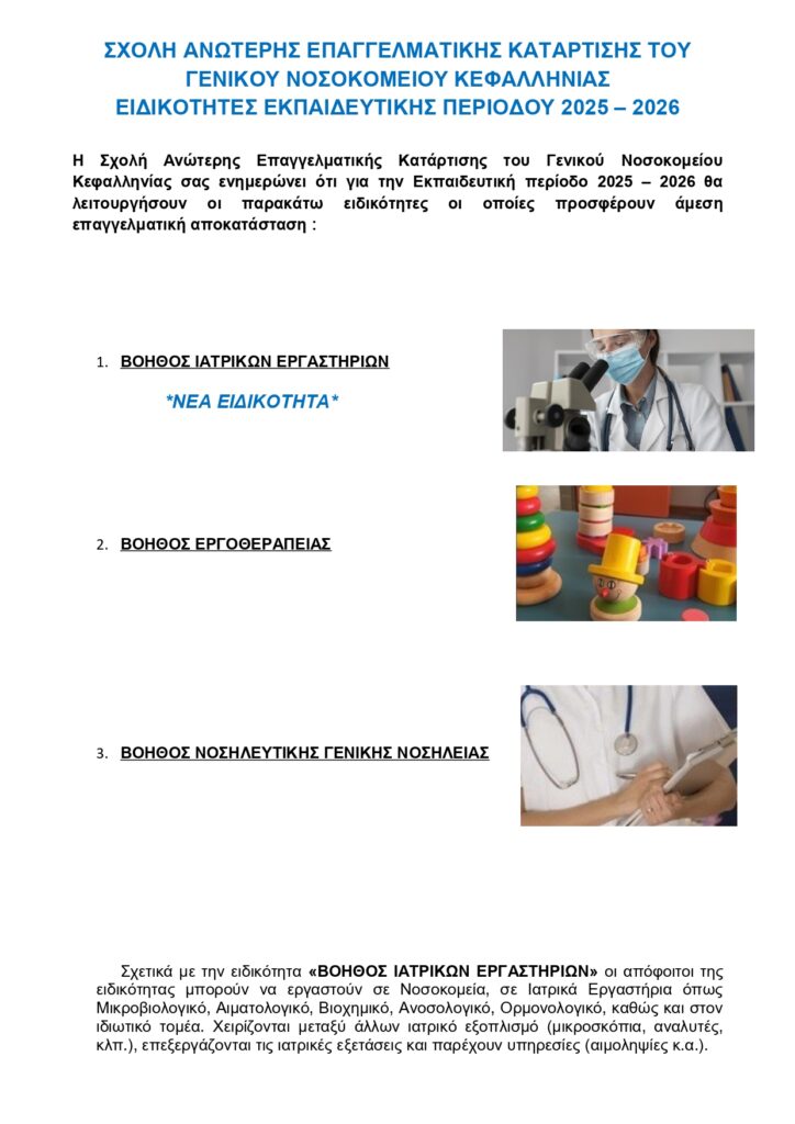 Οι ειδικότητες της Σχολικής Ανώτερης Επαγγελματικής Κατάρτισης του ΓΝ Κεφαλληνίας