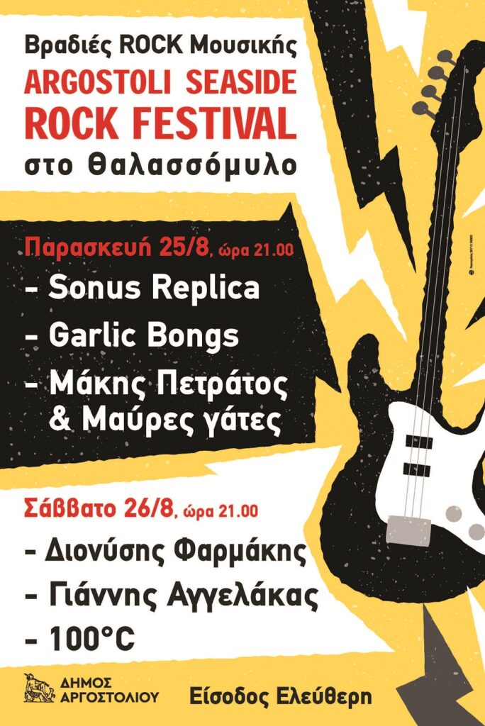 25/8  ΑΡΓΟΣΤΟΛΙ, ΘΑΛΑΣΣΟΜΥΛΟΣ Συμμετέχουν SONUS REPLICA ΤHE ΒAND, GARLIC BONGS . Είσοδος  Ελεύθερη.  Διοργάνωση Δήμος Αργοστολίου