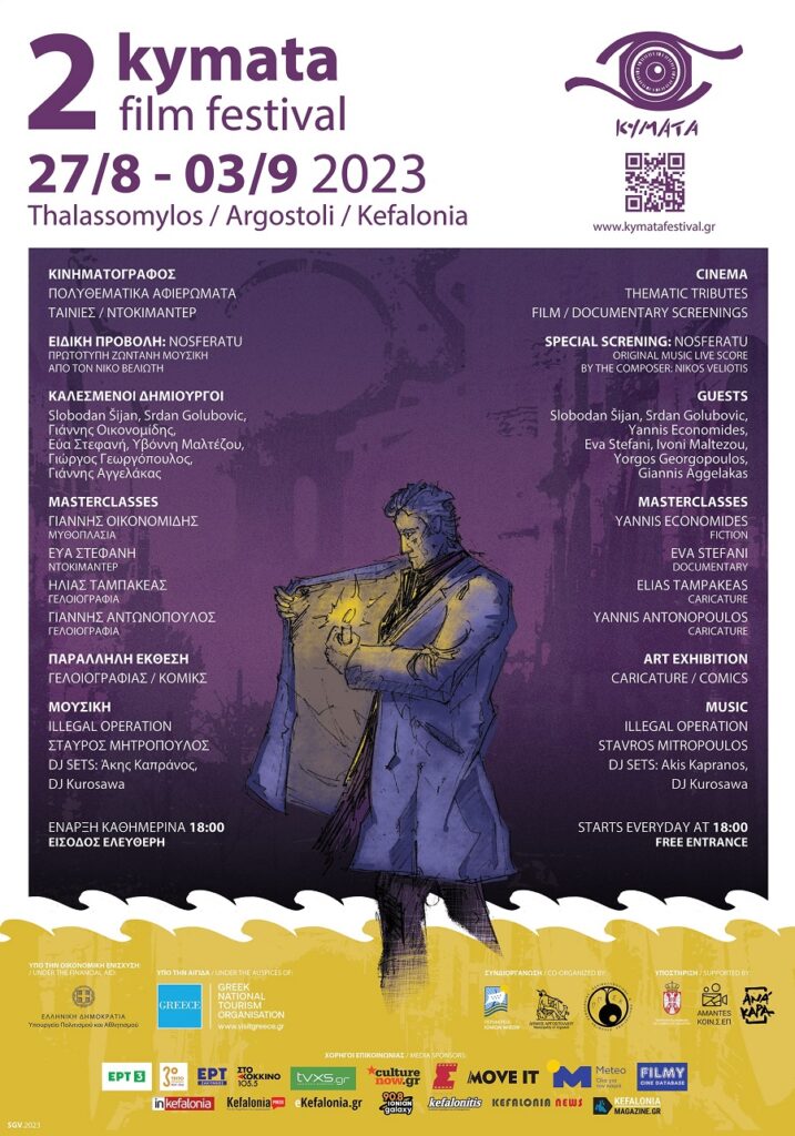 27 ΑΥΓΟΥΣΤΟΥ – 3 ΣΕΠΤΕΜΒΡΙΟΥ  ΑΡΓΟΣΤΟΛΙ, ΘΑΛΑΣΣΟΜΥΛΟΣ. 2ο  ΔΙΕΘΝΕΣ ΚΙΝΗΜΑΤΟΓΡΑΦΙΚΟ ΦΕΣΤΙΒΑΛ «ΚΥΜΑΤΑ 2023». Το Φεστιβάλ περιλαμβάνει αφιερώματα σε σκηνοθέτες από την Ελλάδα και το εξωτερικό, με καλεσμένους τους ίδιους και τους συντελεστές των ταινιών αυτών. Επίσης προβλέπονται διάφορα  εκπαιδευτικά σεμινάρια από καταξιωμένους Έλληνες σκηνοθέτες και γελοιογράφους, (Μυθοπλασία – Ντοκιμαντέρ -Γελοιογραφία) καθώς και μουσικές συναυλίες σε όλη τη διάρκεια του Φεστιβάλ. Ταυτόχρονα στο χώρο του Φεστιβάλ θα πραγματοποιηθεί έκθεση γελοιογραφίας με τίτλο “ΚΥΜΑΤΑ” από τον Σύλλογο Γελοιογράφων με ταυτόχρονη παρουσία τριών μελών τους, καθώς και άλλα δρώμενα. Στο Φεστιβάλ εκτός από τους καλεσμένους θα φιλοξενηθούν επίσης δημοσιογράφοι από την Ελλάδα και το εξωτερικό. Συνδιοργάνωση: Πολιτιστικός & Περιβαλλοντικός Σύλλογος Κεφαλονιάς, ΠΙΝ-Περιφερειακή Ενότητα Κεφαλονιάς, Δήμος Αργοστολίου.