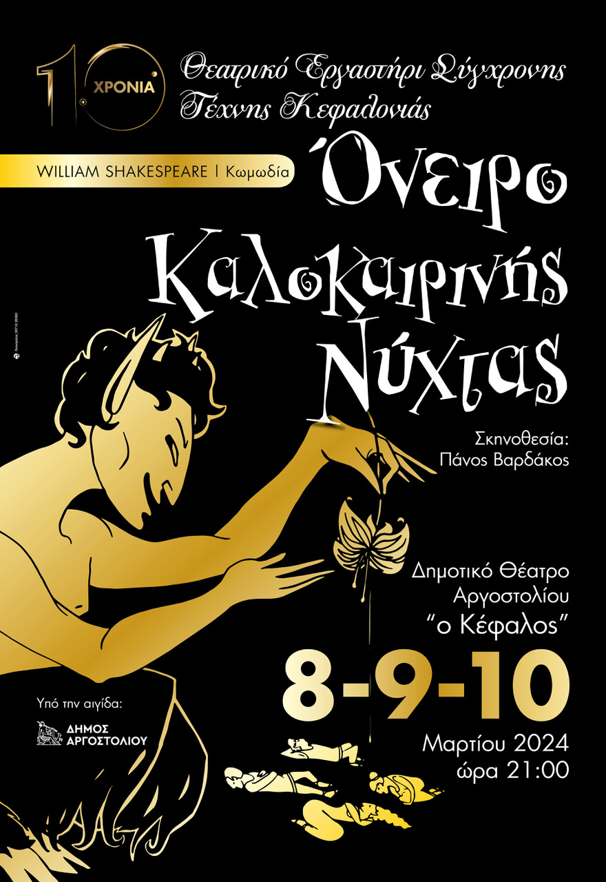 -ΑΡΓΟΣΤΟΛΙ, Δημοτικό Θέατρο «Ο Κέφαλος» στις 8 – 9 & 10 Μαρτίου και ώρα 9:00μμ. Το θεατρικό εργαστήρι σύγχρονης τέχνης Κεφαλονιάς παρουσιάζει την κωμωδία του William Shakespeare “ΟΝΕΙΡΟ ΚΑΛΟΚΑΙΡΙΝΗΣ ΝΥΧΤΑΣ” σε σκηνοθεσία Πάνου Βαρδάκου.