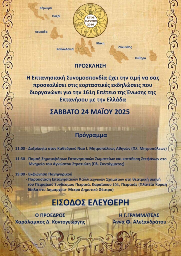 Οι εορταστικές εκδηλώσεις για την 161η Επέτειο της Ένωσης της Επτανήσου με την Ελλάδα
