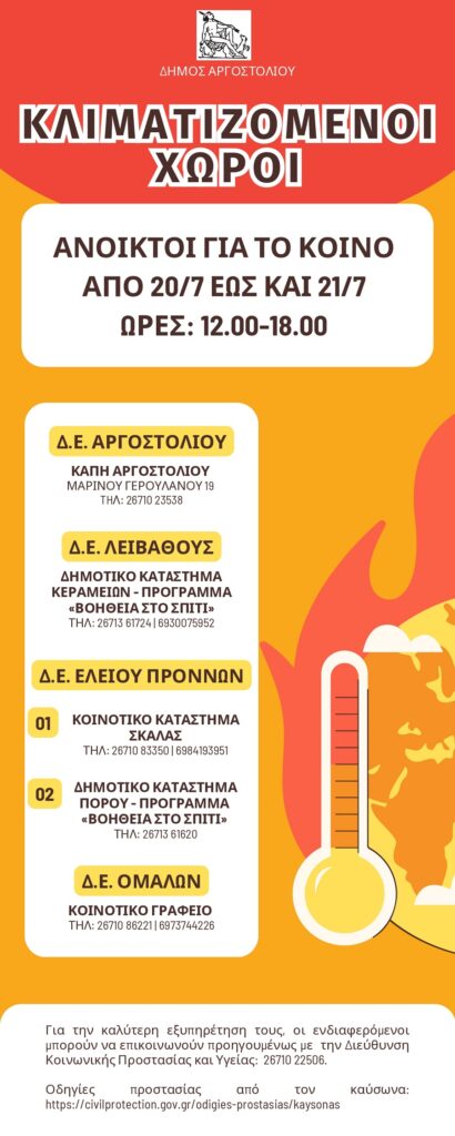 Λόγω των υψηλών θερμοκρασιών που θα επικρατήσουντις επόμενες μέρες (20 και 21/07/2024), ο Δήμος Αργοστολίου, ενημερώνει ότι στην επικράτεια του θα λειτουργούν κλιματιζόμενοι χώροι για την προστασία ευάλωτων ομάδων, ως κατωτέρω: