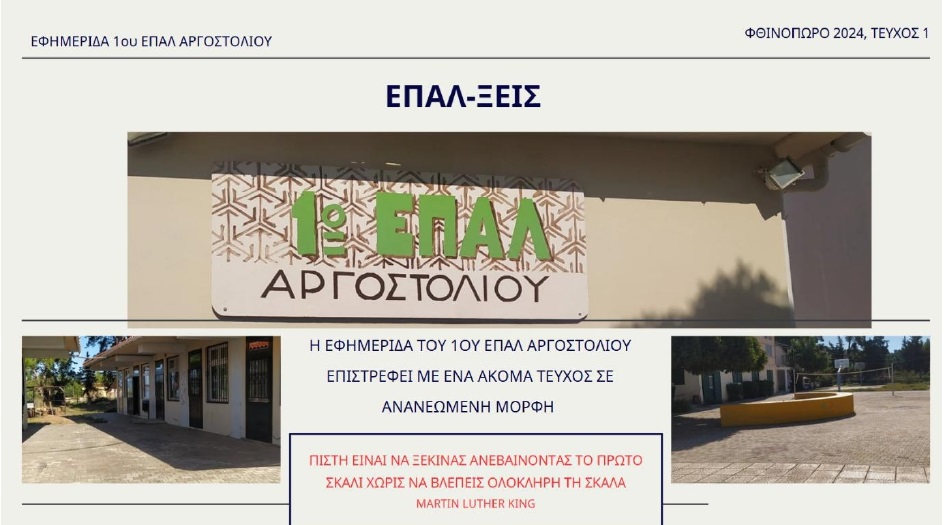 Οι μαθητές/τριες του 1ου ΕΠΑΛ Αργοστολίου εκδίδουν ηλεκτρονική εφημερίδα στo πλαίσιo της δράσης εξωστρέφειας για δεύτερη χρονιά με τίτλο “ΕΠΑΛ-ΞΕΙΣ’’