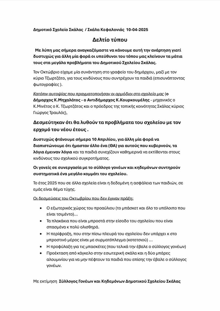 Οι υπεύθυνοι του τόπου κλείνουν τα μάτια στα μεγάλα προβλήματα του Δημοτικού Σχολείου Σκάλας