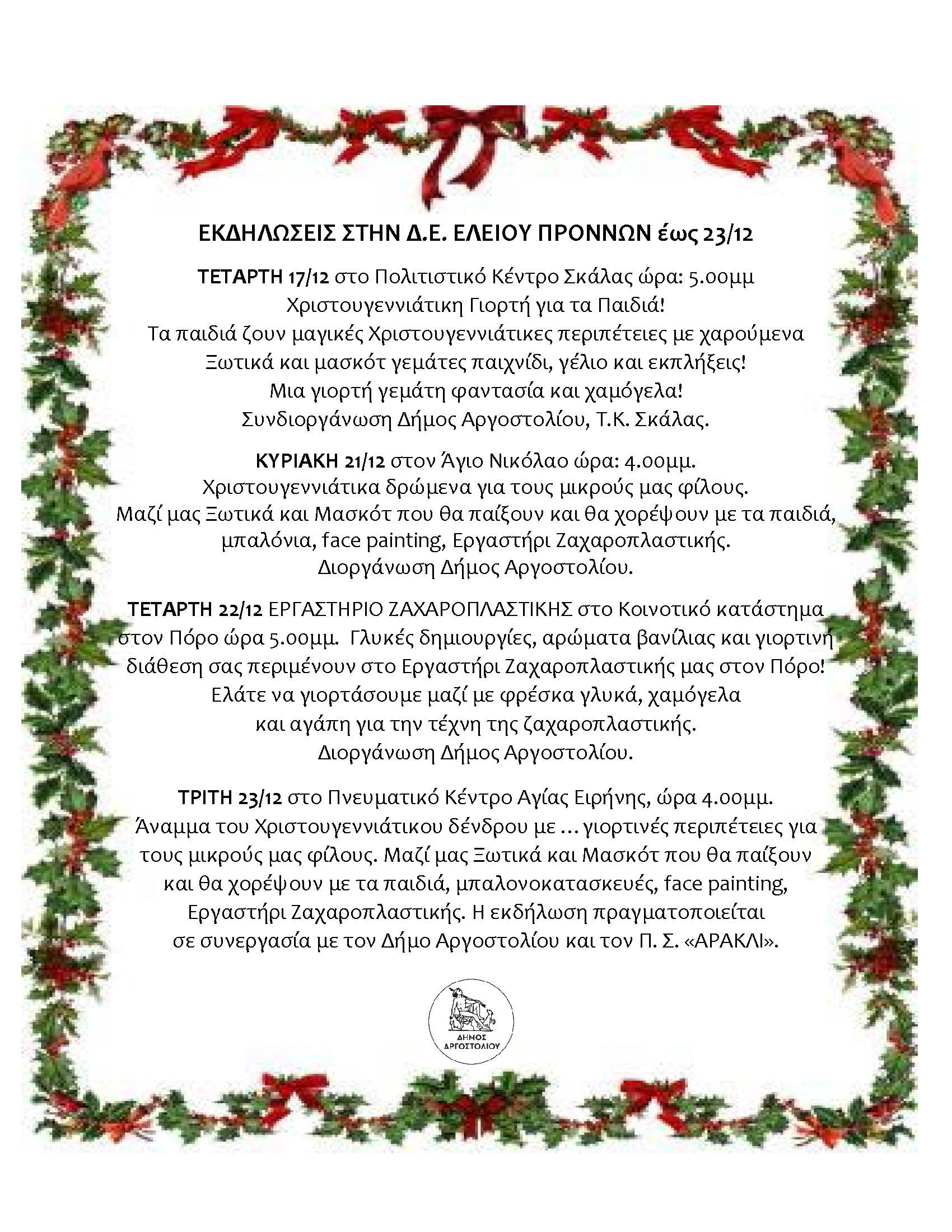 Οι Χριστουγεννιάτικες εκδηλώσεις στην Δ.Ε. Ελειού – Πρόννων έως τις 23/12
