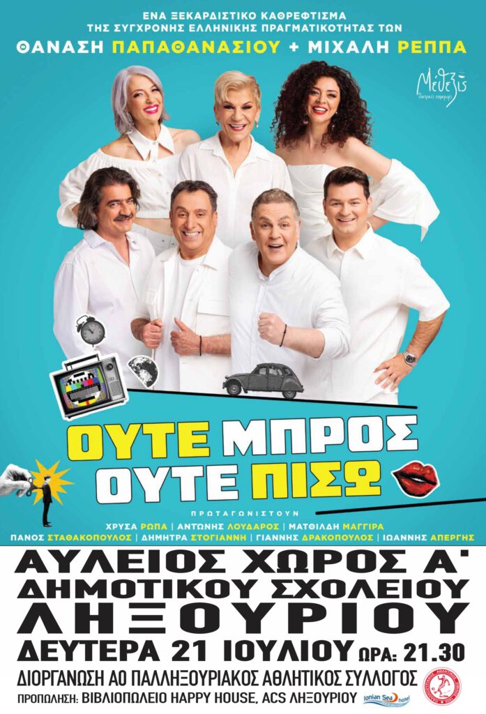Ο Θανάσης Παπαθανασίου και ο Μιχάλης Ρέππας παρουσιάζουν αυτό το καλοκαίρι σε όλη την Ελλάδα τη νέα τους παράσταση,«Ούτε Μπρος ούτε Πίσω». Πρωταγωνιστούν: Χρύσα Ρώπα, Αντώνης Λουδάρος, Ματθίλδη Μαγγίρα, Πάνος Σταθακόπουλος, Δήμητρα Στογιάννη, Γιάννης Δρακόπουλος, Ιωάννης Απέργης.
