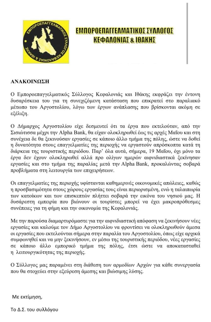 Ο Εμποροεπαγγελματικός Σύλλογος εκφράζει έντονη δυσαρέσκεια με την κατάσταση στην παραλιακή λόγω των έργων ανάπλασης