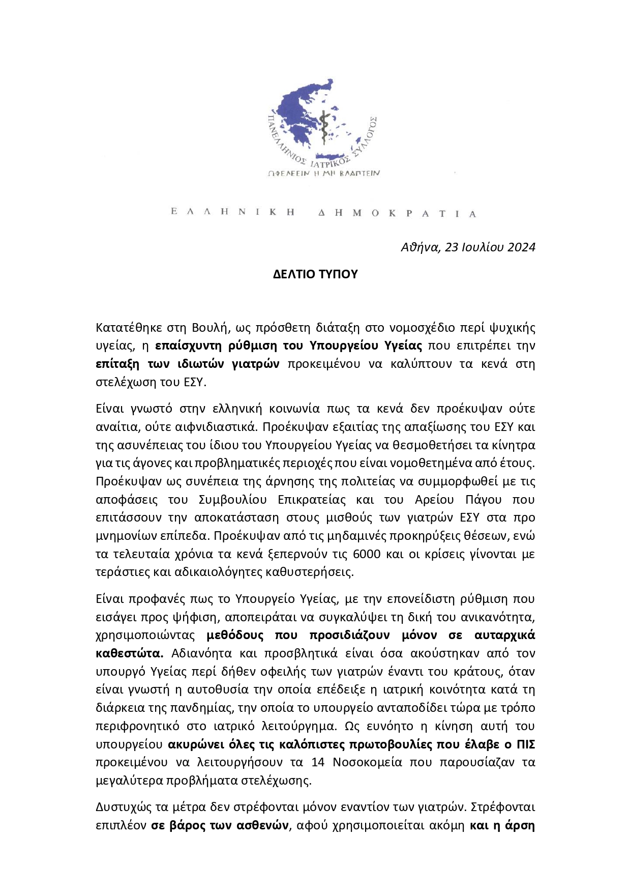 Ο Ιατρικός Σύλλογος Κεφαλονιάς & Ιθάκης είναι κατά του Νομοσχεδίου για την ψυχική υγεία και την επίταξη ιδιωτών ιατρών
