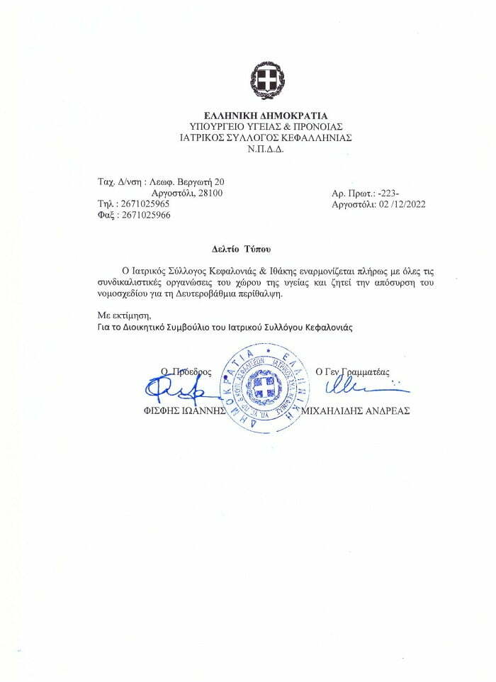 Ο Ιατρικός Σύλλογος κεφαλονιάς και Ιθάκης ζητά την απόσυρση του νομοσχεδίου για την δευτεροβάθμια περίθαλψη